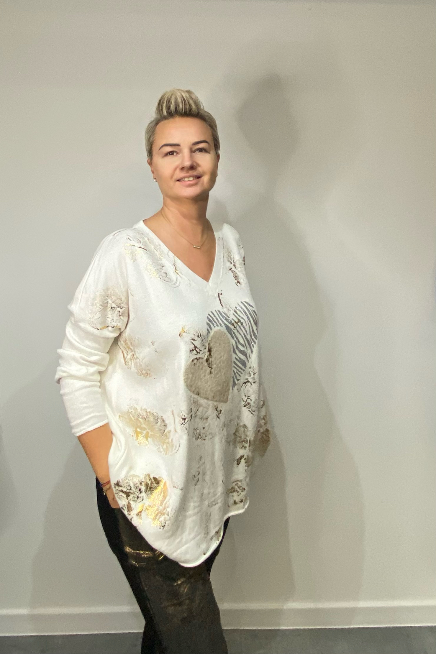 Bluzka delikatna z viscozy, przód nakrapiany złotem, tył bawełniany gładki. Rękawki z możliwością podwinięcia i zapięcia na guzik. Bardzo delikatna bluzeczka z dekoltem na okrągło. Włoski model, występuje w 3 kolorach. Biust do 100cm.