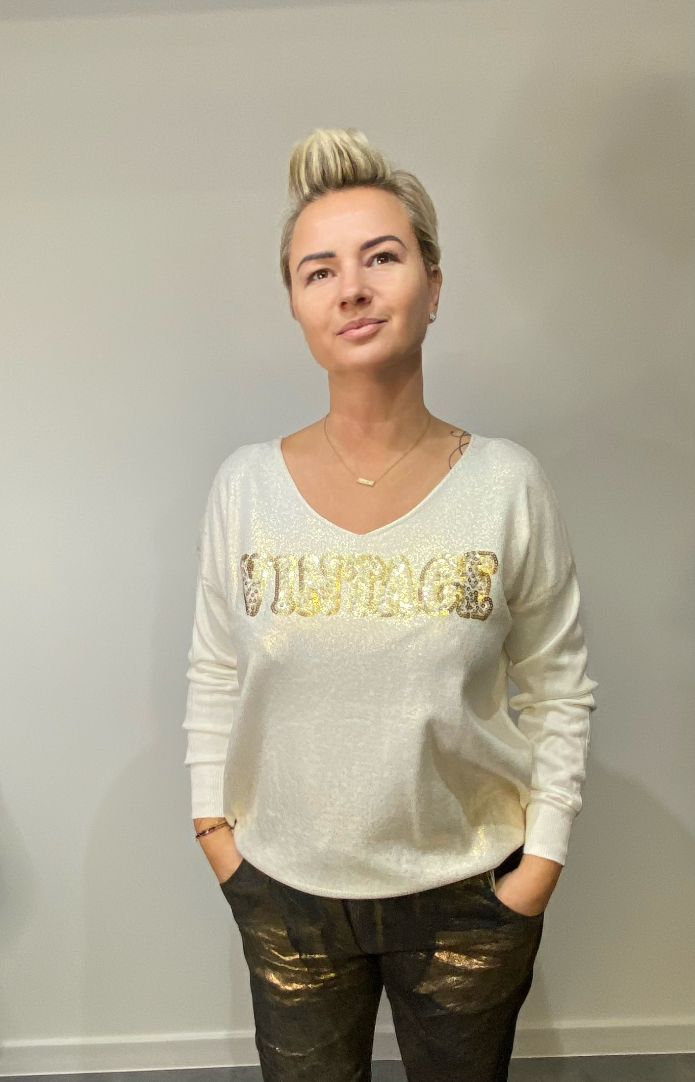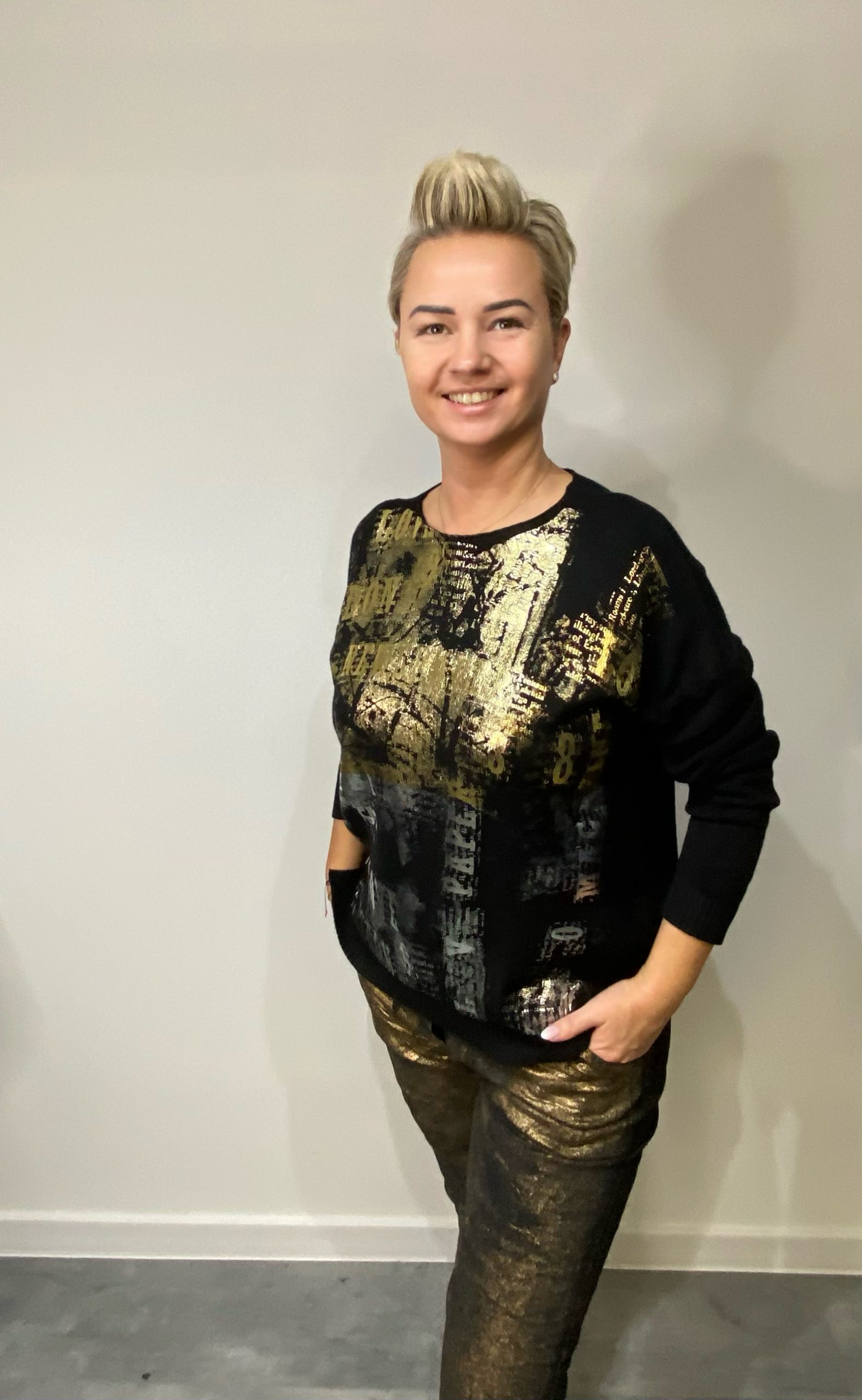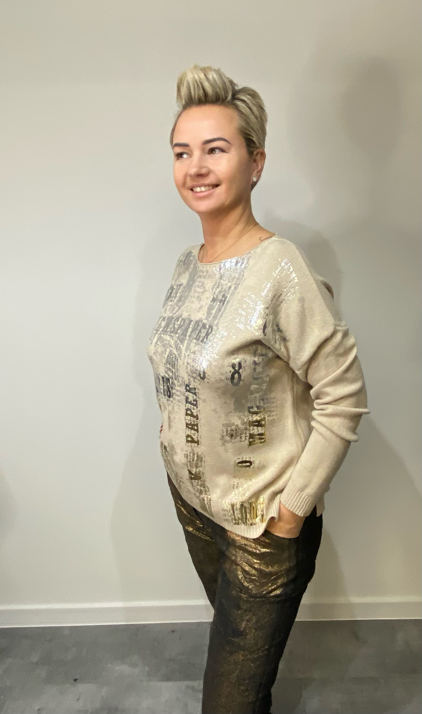 Sweterek kaszmirowy, zdobiony złotymi i srebrnymi napisami.